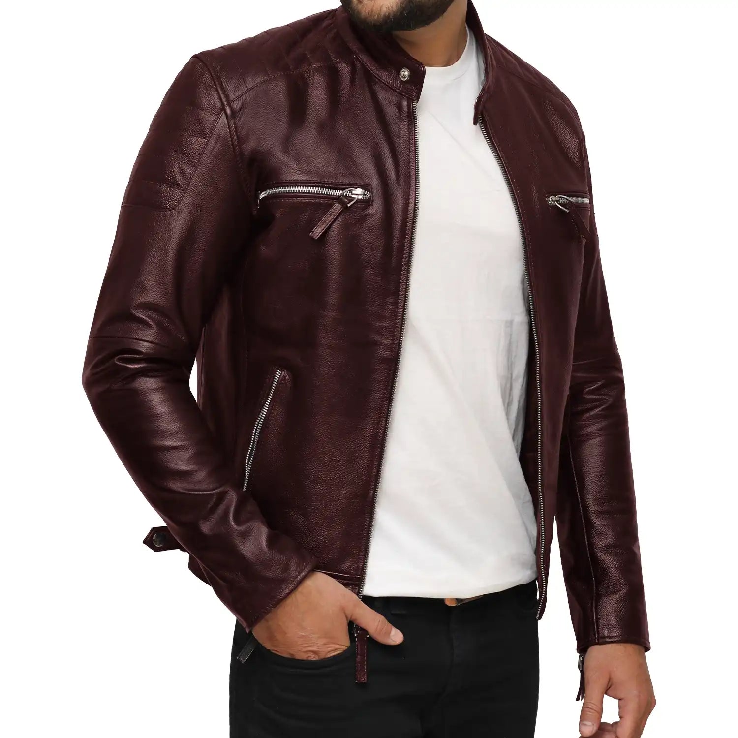 Also, significant attributes of the Men's Maroon Slimfit Leather Jacket enlist its straight yet very smooth zipper closure, zippered cuffs, four front pockets with zippers, and a snap-tab round collar.