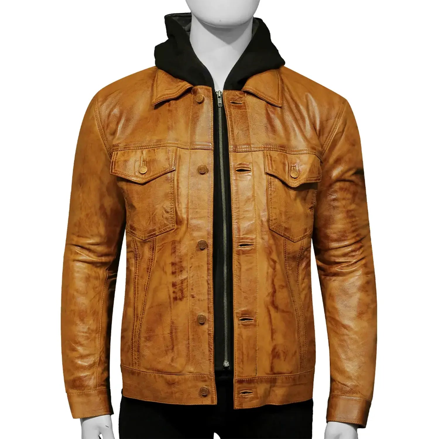 Utter style is not all about the outward, but it's too concerned with an inner side that is pacifying like a feather and warm like an untouched yak skin. Therefore, the presented Mens Brown Leather Jacket with Hood holds a soothing inner viscose lining.