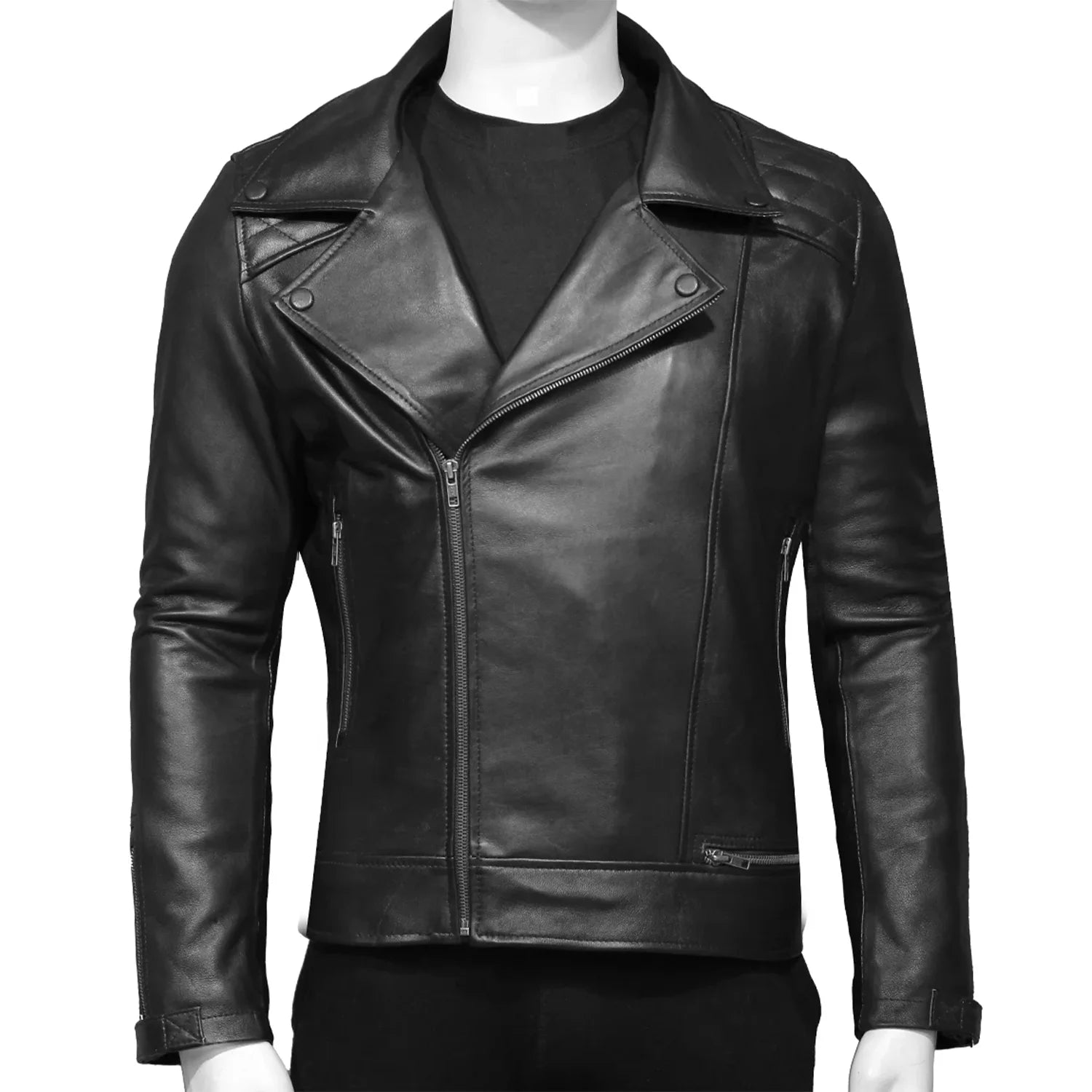 FULLY EQUIPPED: Asymmetrical collar with front zipper closure, three zipped pockets, and quilts on shoulders stamps the finest finishing of Mens Quilted Black Motorcycle Leather Jacket.