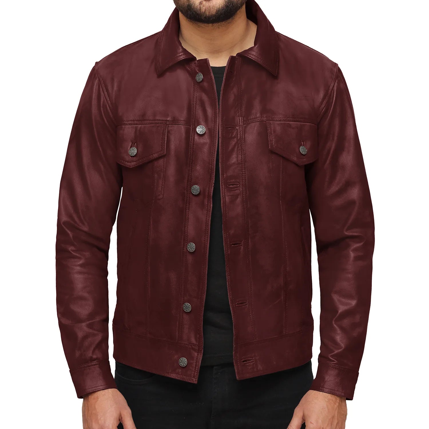 Even the Men's Maroon Trucker Leather Jacket looks simple, but you will radiate confidence and class when you feel the coziness of its inner viscose lining.